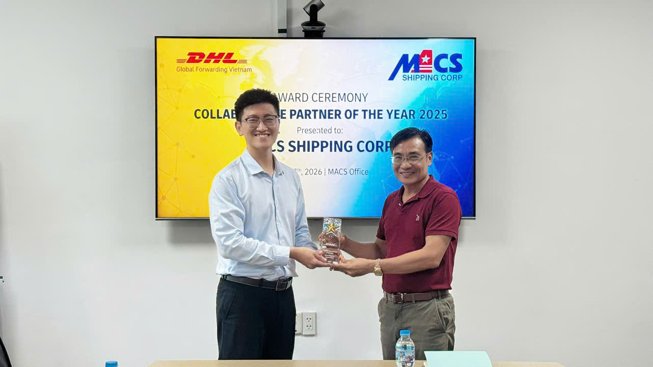 Chiều ngày 17/04/2026, tại trụ sở chính của Công ty Cổ phần Hàng hải MACS, buổi trao tặng giải thưởng "Collaborative Partner of the Year 2025" từ đối tác chiến lược toàn cầu DHL đã diễn ra trong không khí trang trọng. Đây là sự ghi nhận đầy ý nghĩa dành cho những nỗ lực hợp tác bền vững, hiệu quả và tinh thần đồng hành chiến lược giữa hai doanh nghiệp trong suốt năm 2025.